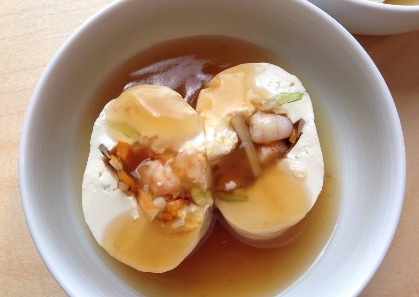 This recipe is very Japanese dish, like one of the Japanese kaiseki. Simmered in lightly seasoned broth for a little bit longer time (about 20 ~ 30 mins) with a low heat. Eat with the thickened broth. For your taste, when thickening, you can add a small quantity of sake and soy sauce. It's also good to have cool tofu with warm thickened broth.
