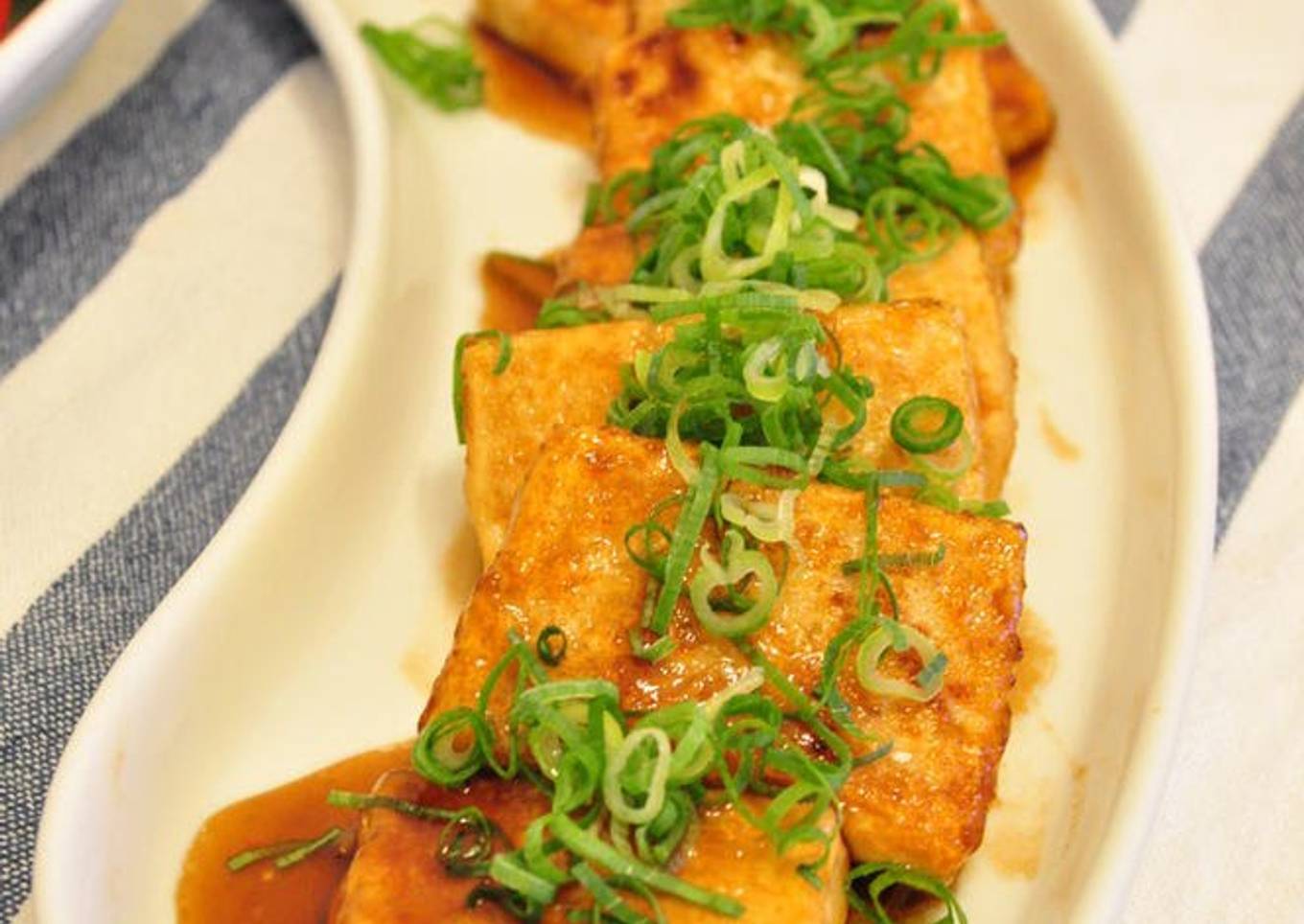 - When both sides are golden brown, add ② and coat the tofu. Add green onion as well to taste.