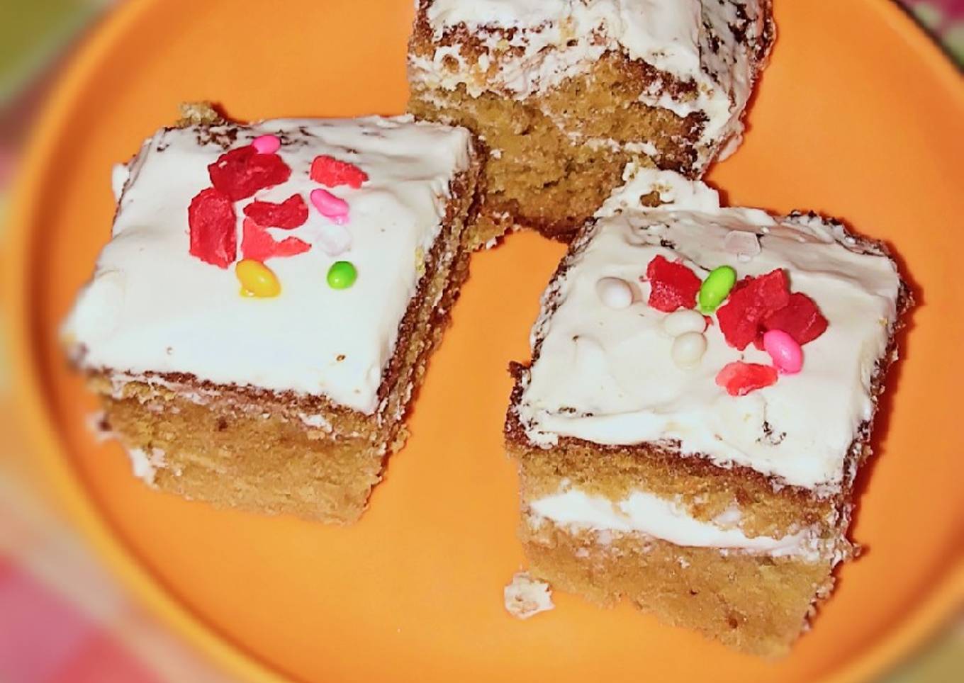 - Now,take a bowl, add the cream,sugar and vanilla extract beat the batter,for making the thick and smoothly batter, then cut the cake spread the whipped cream,and sprinkle the tooty frooty.