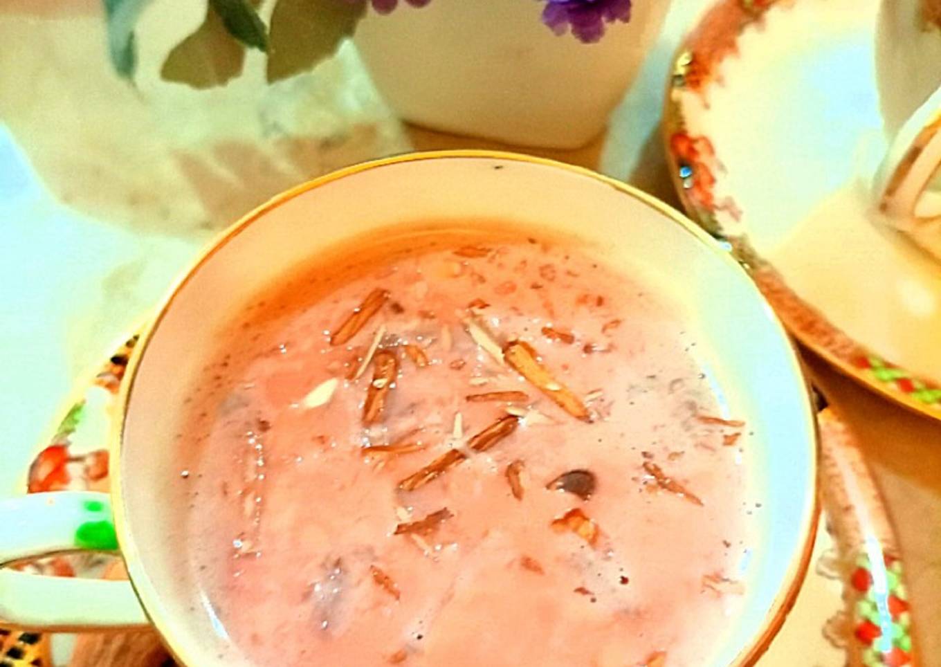 Kashmiri chai is a milk tea characterized by its dusty pink color and garnishing of crushed nuts.