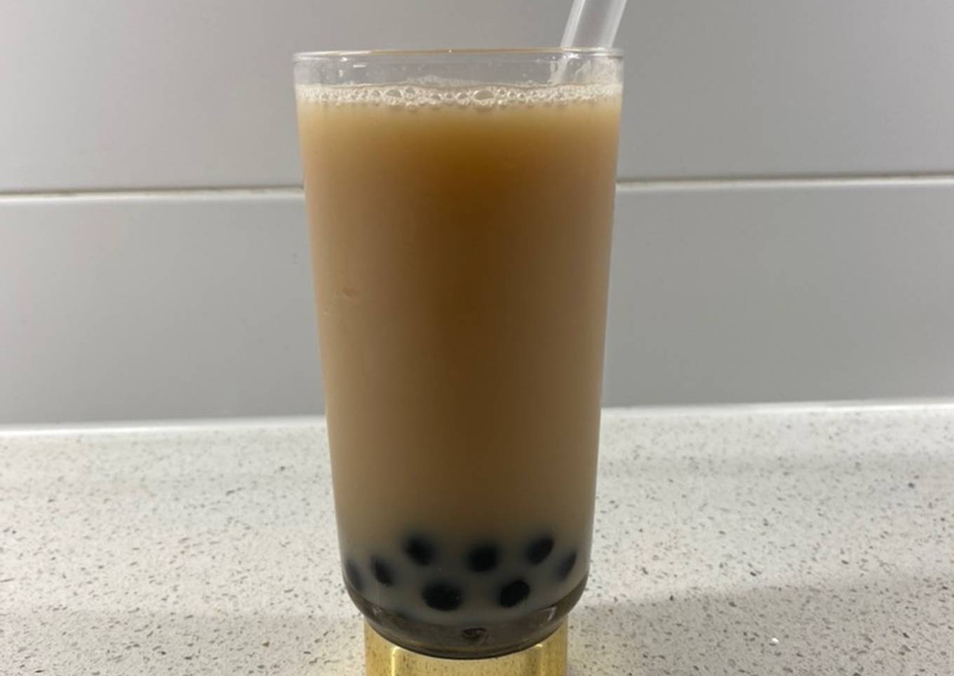 - Then add some of the cooled down milk and stir the mixture. Now taste the drink and adjust sweetness and milk if required (add more honey or milk). Give the drink one final stir and place a bubble tea straw in the drink and enjoy.