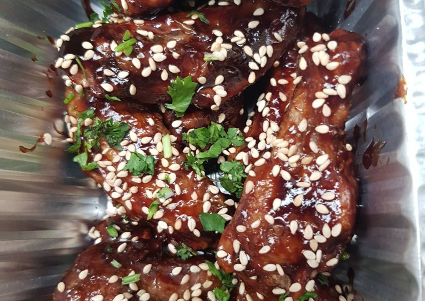 - In a seprate pan add 2 tbl sp oil, 2 tbl sp oyster sauce, 2tbl sp soya sauce, 4 tbl sp tamato ketchup and 2 tbl sp of honey (or 4tnl sp sugar). Mix it on high flame till it become thick. Add a pinch of salt and black pepper. Mix the wings in hot sauce and sprinkle some sim sim and green onions on top