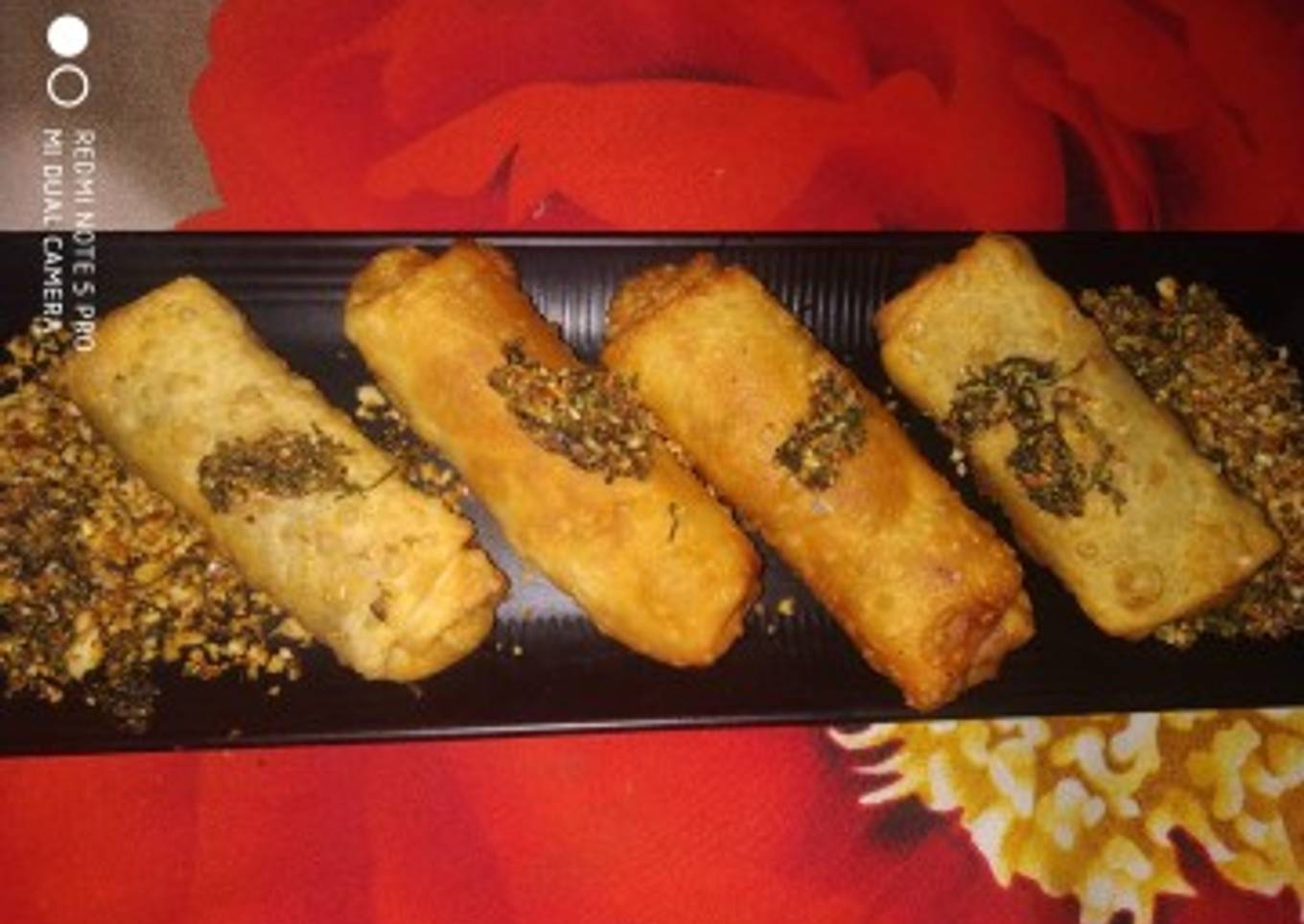 - Then put 2tsp of filling in between roll puri folde it left and right then up and down to make a roll if it will not tide at last then put wet finger on last folde to tide roll then deep fry all roll cool it.ready to eat yummy.